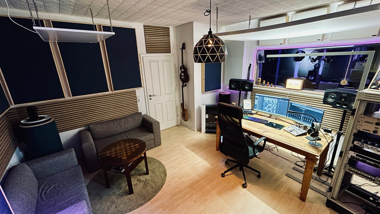 Unser gemütlicher Aufnahmeraum bietet eine optimierte Akustik, besonders für Vocal-Recordings, und einen direkten Blick in den Regieraum.